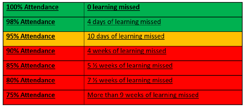 Pupils who have not passed the 4-week monitoring period will now be considered for referral to the local authority. Our goal is for all pupils to meet a target of 93% to 100% attendance.The 4-stage monitoring process is being used to indicate the level of your child's school attendance: